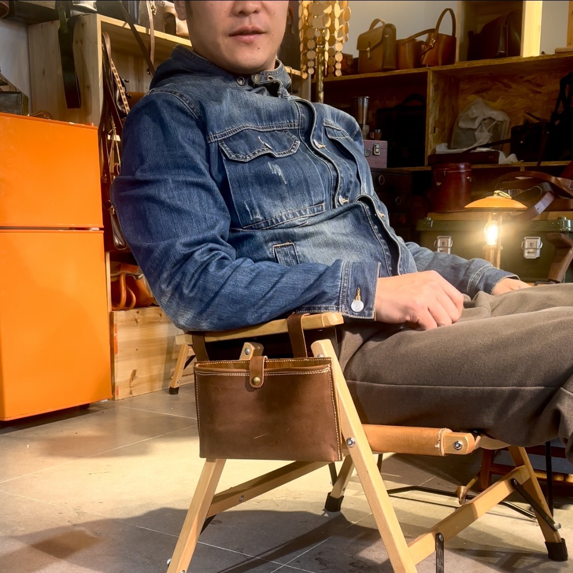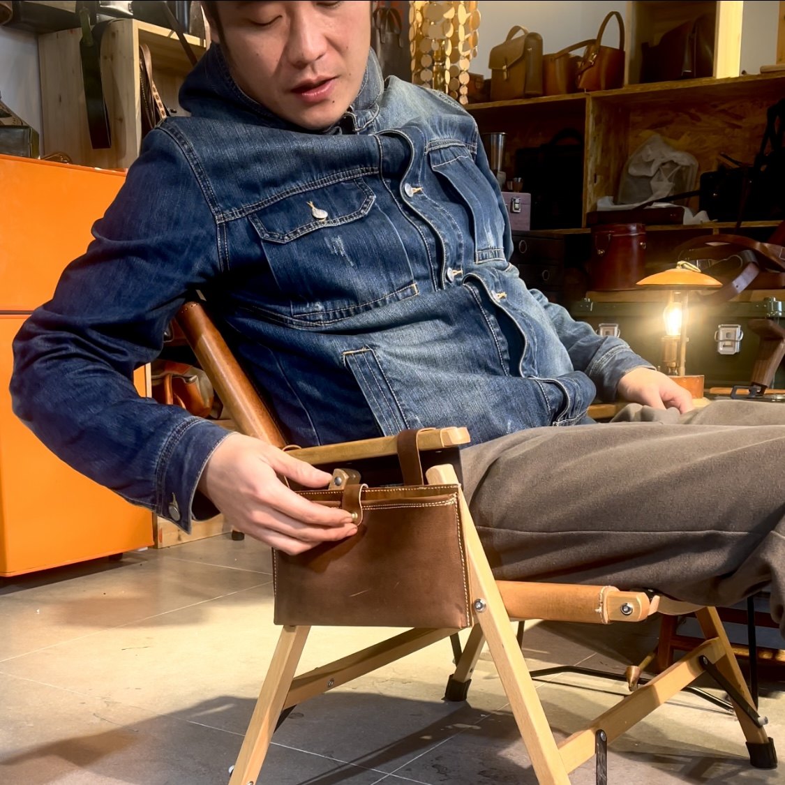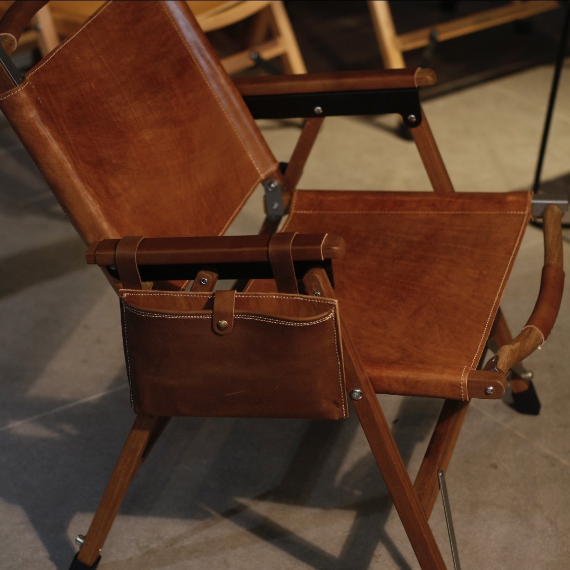 天然木のフレームと本革張りの座面が上質な雰囲気を演出するアウトドアチェアです。 折りたたみ式で持ち運びや収納が簡単にでき、使わない時はコンパクトに保管できます。 アームレスト部分には便利な革製の収納ポケットが付いており、小物を手元に置いておけます。 野外活動はもちろん、室内でも使える実用性とデザイン性を兼ね備えた一品です。