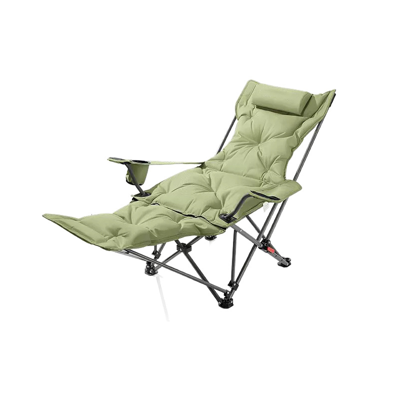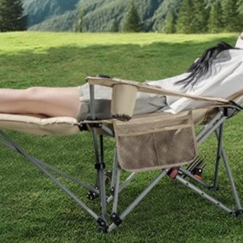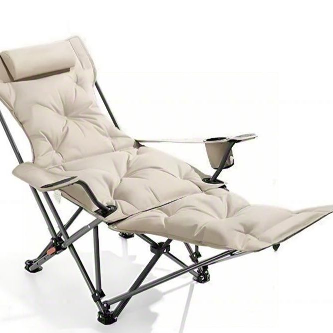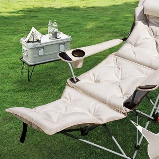 キャンプや野外活動に最適なアウトドアチェアです。 リクライニング機能搭載で背もたれと足置きを自由に角度調整でき、ゆったりとくつろげます。 厚手のクッション材が体全体を優しく支え、長時間座っても疲れにくい設計です。 便利な飲み物置きも付属し、折りたたみ式で持ち運びや収納にも便利な実用的な一品です。